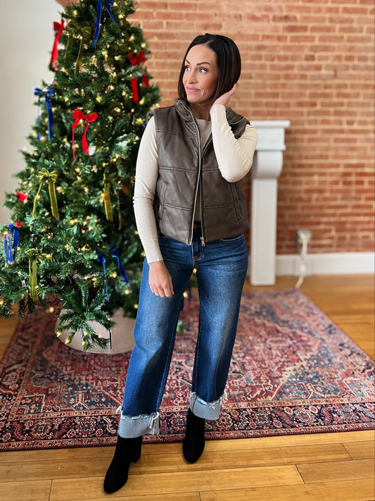 Brown Faux Leather Puffer Vest