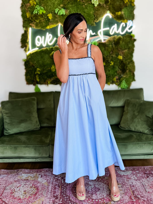 Blue/ White Striped Embroidered Contrast Trim Midi Dress