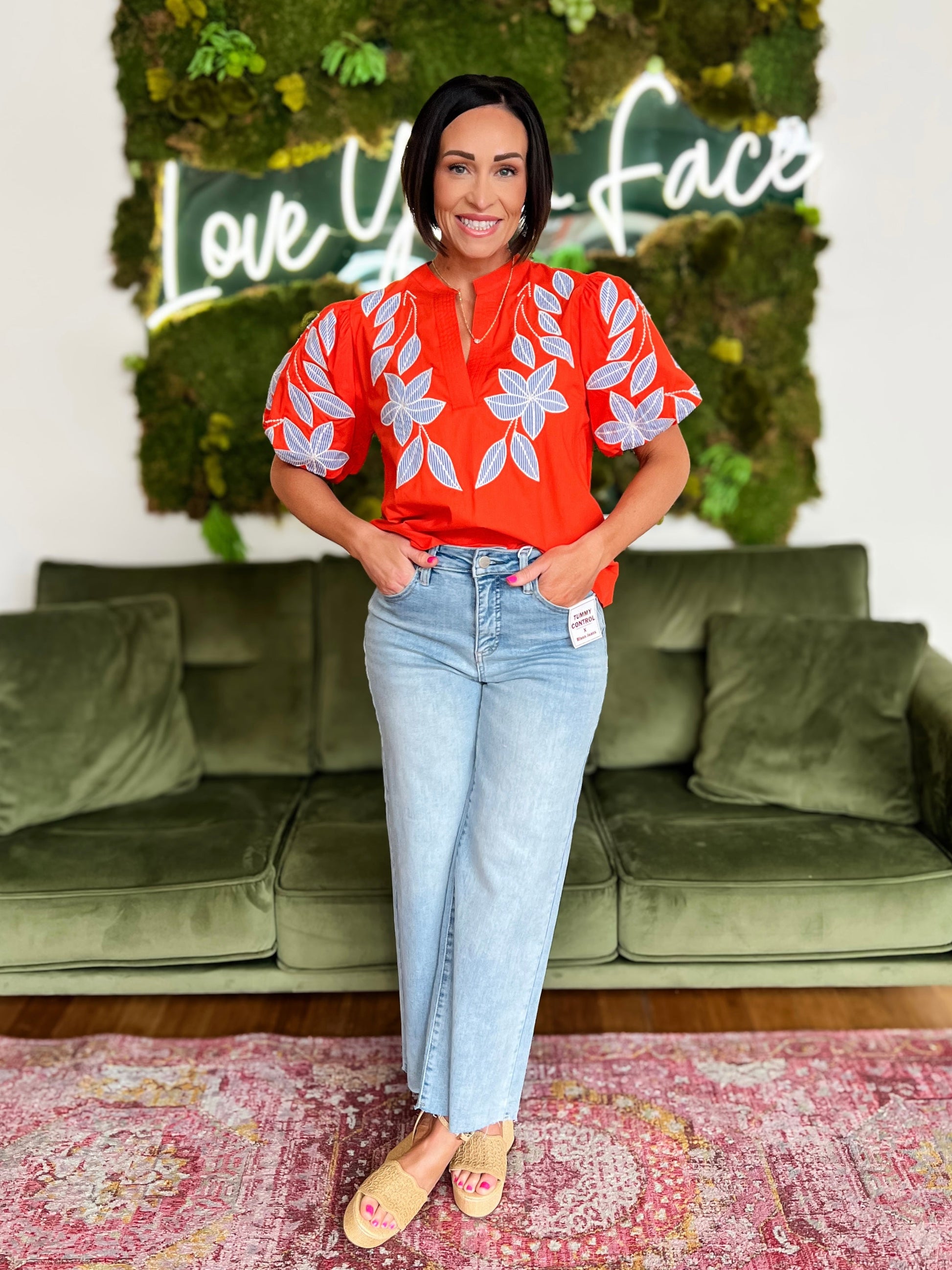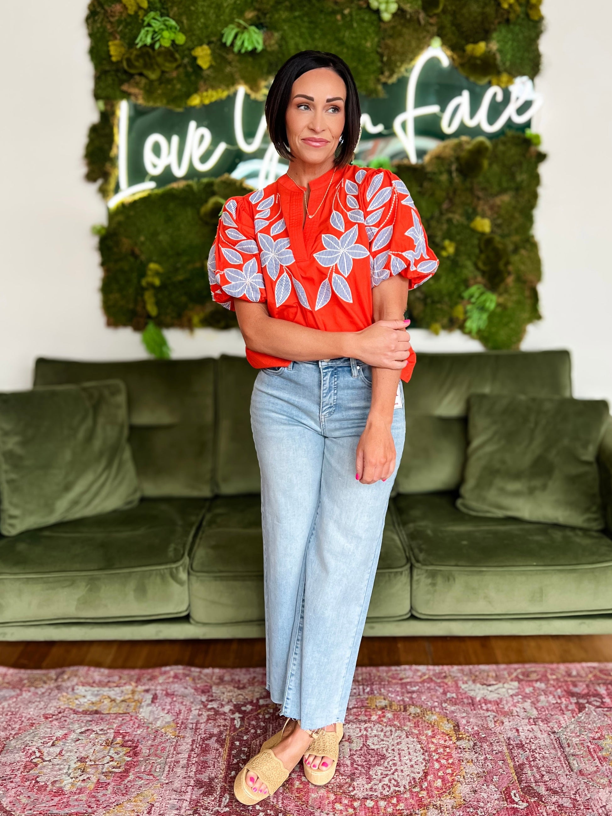 Orange Puff Sleeve Embroidered Detail Top