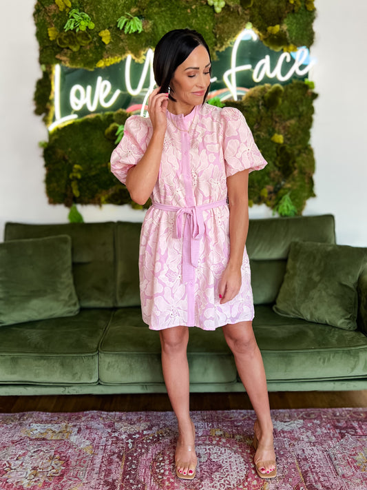 Pink Floral Eyelet Pattern Button Front Mini Dress