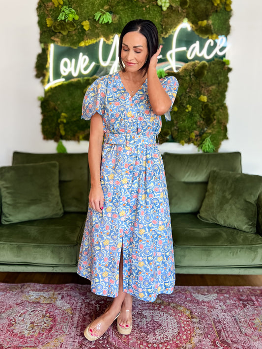 Blue Multi Embroidered Scalloped Edge Midi Dress